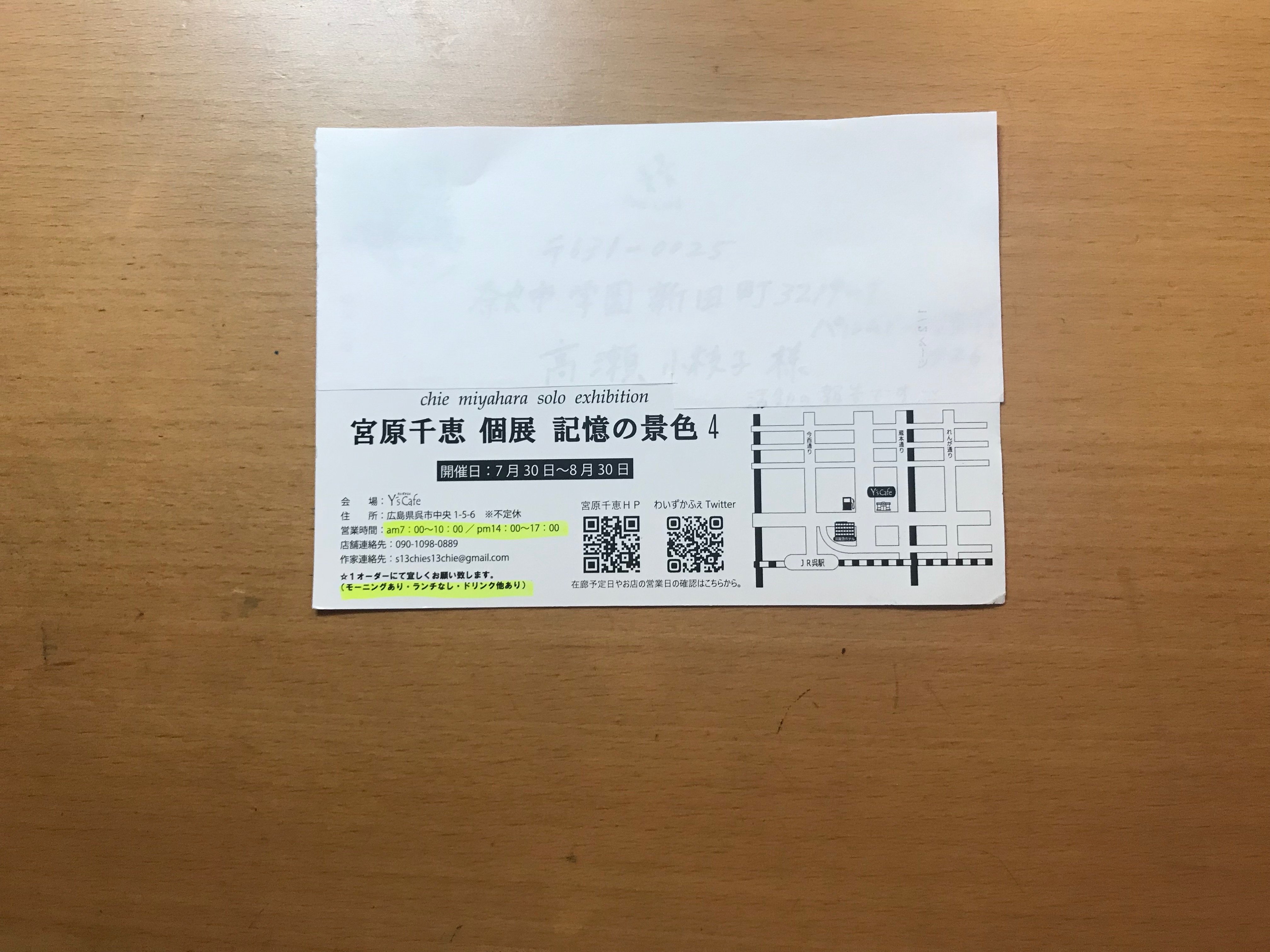 メンバー作家の宮原千恵 開催日 2021.7.30~8.30 会 場 Y’s Cafe 住 所 広島市呉市中央 1−5−6 営業時間 7:00〜10:00/14:00〜17:00 店舗連絡先 090ー1098−0889 作家連絡先 s13chies13chie@gmail.com